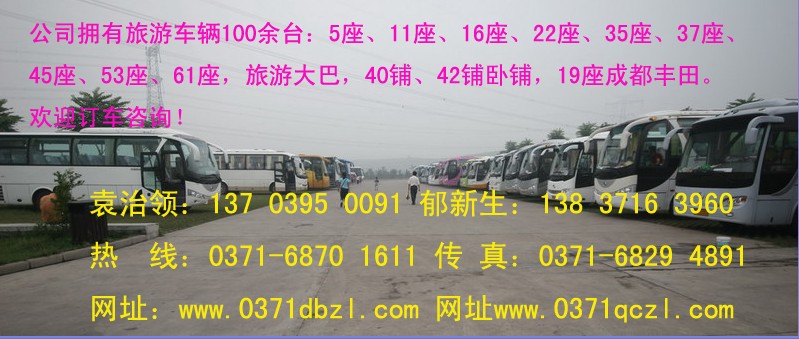 鄭州包車、鄭州學生包車、鄭州旅游包車鄭州旅游大巴包車服務有限公司是目前鄭州市規模最大、服務最完善的旅游以及旅游包車龍頭企業之一,是“河南省旅行社協會常務理事單位”、“河南省旅協導游領隊分會副會長單位”和“鄭州旅游協會副會長單位”。客戶群涉及旅行社,政府部門,黨政社會團體,學校,工廠,會展,房產公司及外商,個人等全社會各行各業。目前公司擁有各型大巴,中巴,小巴及商務車數十輛。主要車型有:7座別克商務車,14座奔馳商務面包車,19座、21座現代中巴,29座、33座、37座、41座、45座、47座、53座金龍和新款宇通。